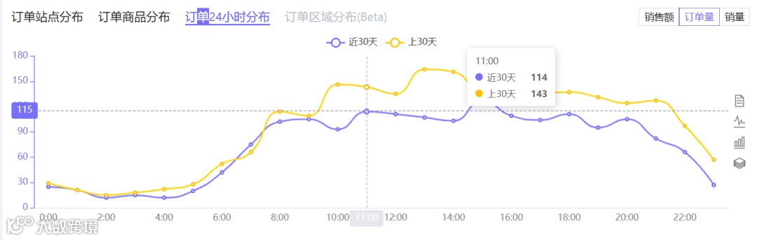 从选中的这个月数据来看,其中订单数据到每天的8点就呈现明显的上升趋势,18点有一个短暂下滑空档,而19点继续上升,直到晚上的21点结束高峰期。