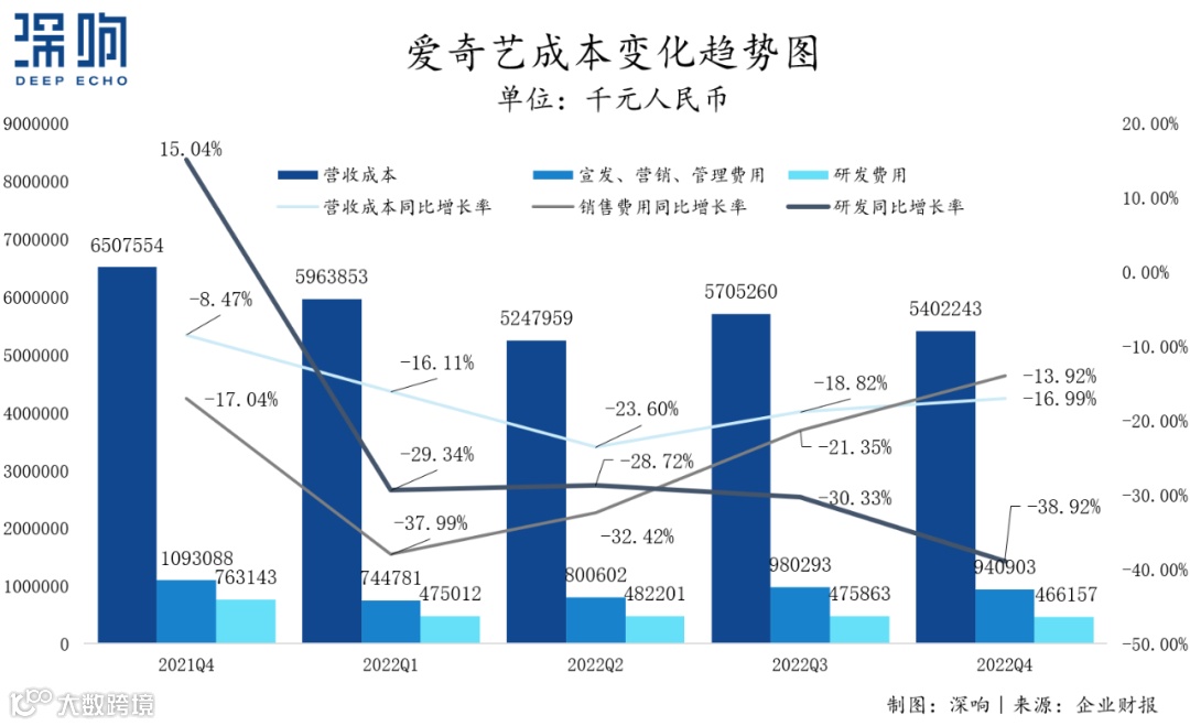 过去一年,行业屡屡传出项目过会难的消息,诸多可上可不上的内容、题材故事薄弱的项目被砍掉,2022全年上新、备案数量明显减少,降本增效可以说是行业的整体趋势。爱奇艺也在项目取舍和一系列精简措施中有效降本。从财报来看,2022年Q4爱奇艺总运营成本费用为68亿,比2021年Q4减少16亿,其中营收成本从65亿降到了54亿元,宣发、营销、管理费用从10亿元降到了9.4亿元。