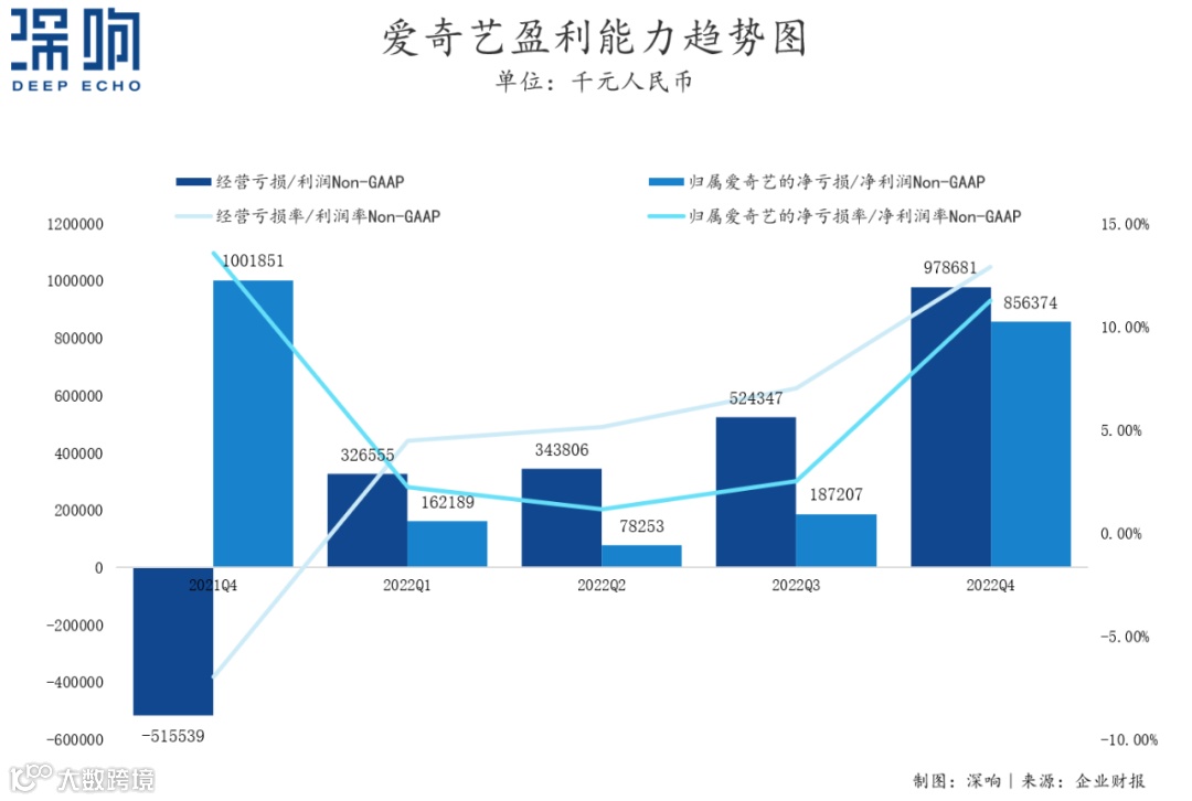 2月22日,爱奇艺(NASDAQ:IQ)交出了2022全年的财报成绩单,并给出了答案。基于非美国通用会计准则财务指标(以下简称non-GAAP)的全年运营利润为22亿元,而2021年为亏损30亿元,运营利润率7%;第四季度non-GAAP运营利润为9.79亿元,去年同期为亏损5.15亿元,运营利润率为13%。