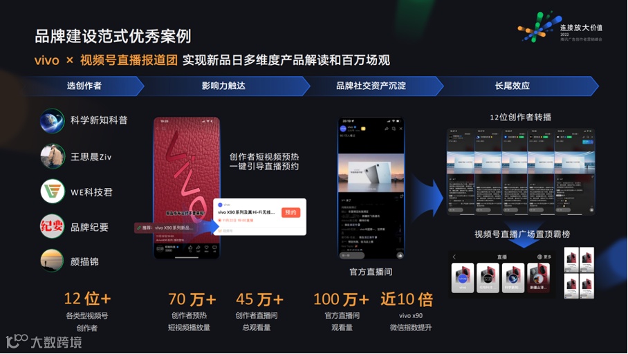 品牌建设、产品种草、私域转化,其实也正是腾讯广告总结出的三大创作者营销范式,不同范式下营销操作配比和应选择的创作者类型都有差异。例如今年vivo在X90 系列新品发布时,就选择了超12位不同类型的创作者组成了一个“直播报道团”,使新品发布会成为了热点营销事件,迅速放大了品牌声量和影响力。