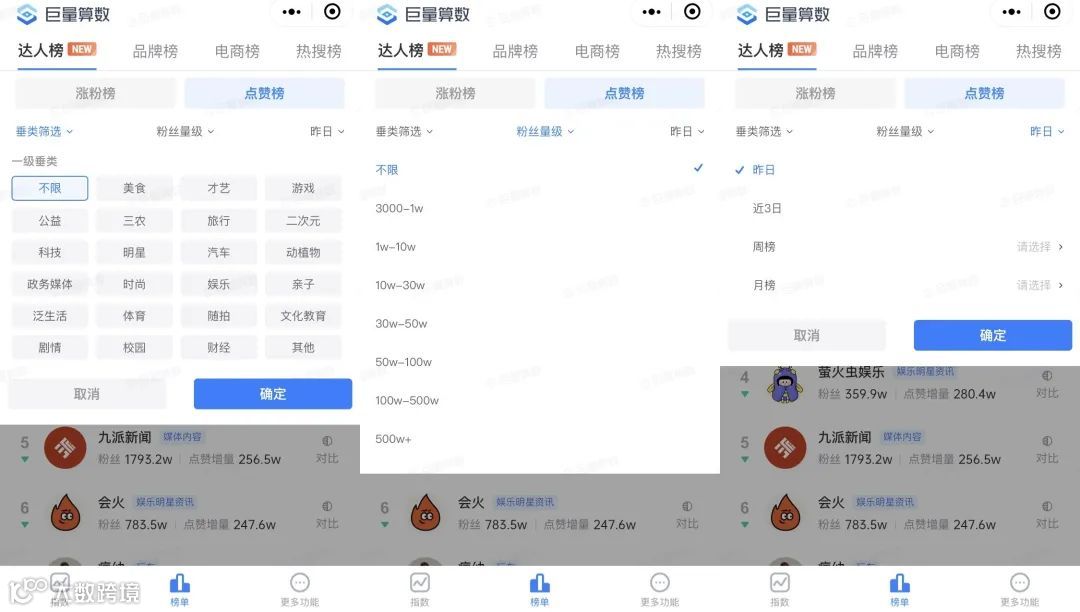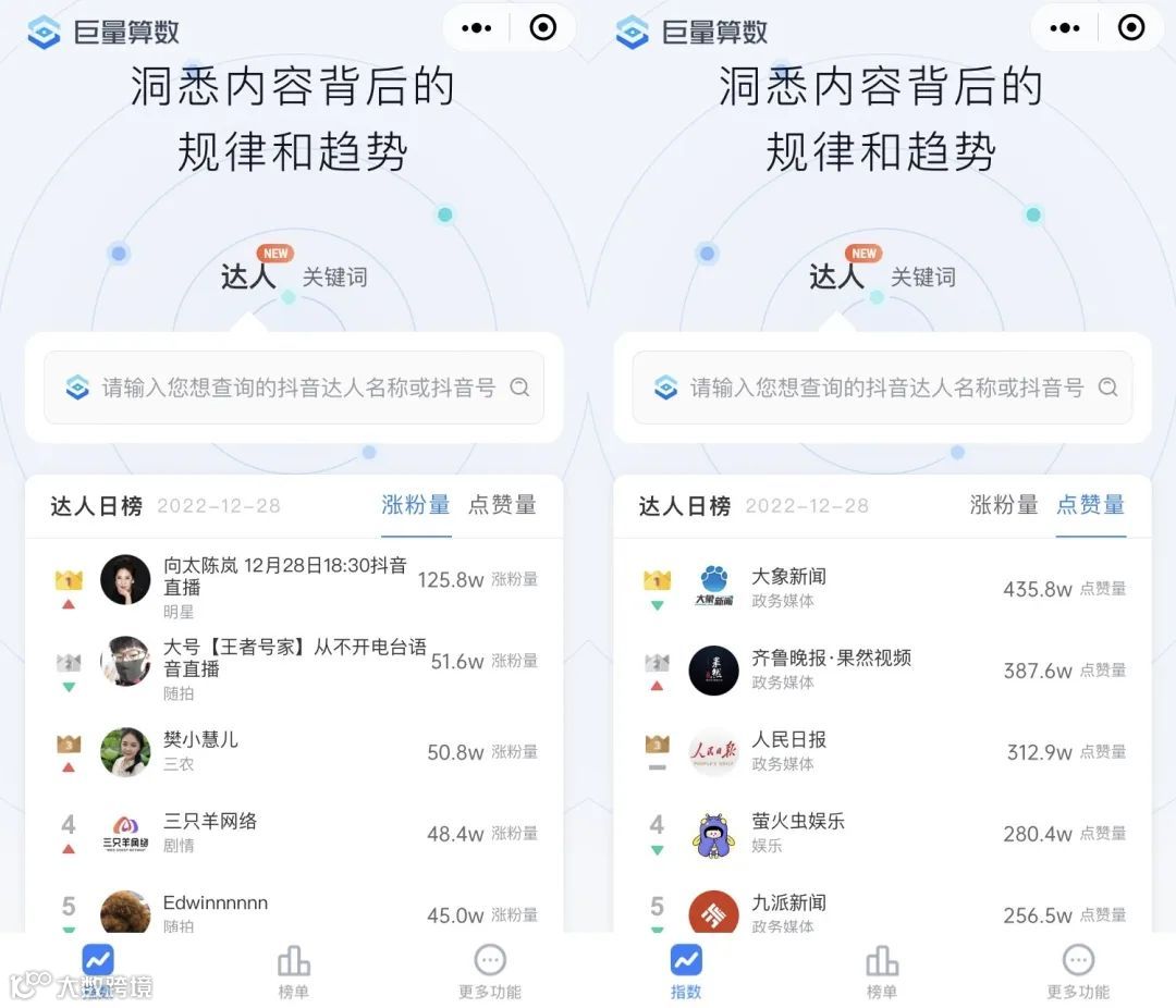 巨量算数小程序首页中,“达人日榜”在最显眼的位置。这一榜单会呈现两个官方达人价值指标项目——涨粉量和点赞量。