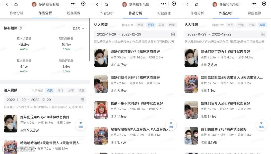 以抖音达人多余和毛毛姐为例,“作品分析”会呈现他近7天和近30天的账号作品的核心指标——稿均点赞量、稿均涨粉量、稿均分享量、稿均评论量,以及各项数据的增长情况。同时,多余和毛毛姐的视频及基础作品数据,包括点赞量、评论量、分享量、收藏量等四个维度,也同样清晰呈现,且支持选择三个月内的任意30天进行查看。