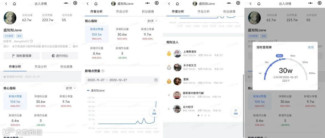 在达人涨粉里程碑中,达人涨粉的时间线和爆发点清晰可见——盛知知Jane在今年12月17日达到1万粉丝,用时213天;紧接着在12月21日就达到了10万粉丝;12月27日,他的粉丝量就达到了30万。