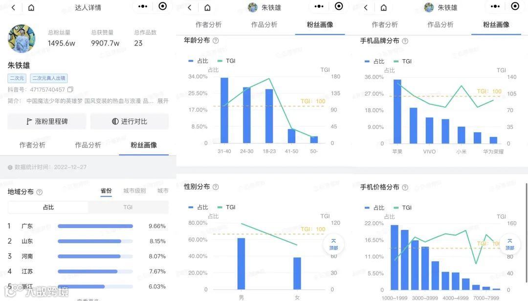 以抖音涨粉量日榜排名前列的朱铁雄为例,他的粉丝群体中广东IP占比最高,其次是山东和河南;各个年龄段中,31-40岁占比最高,达到34%,但18-23岁的用户对他的内容偏好度更强(TGI更高)。同时,朱铁雄的男性用户占比超过60%,使用苹果手机的用户占比将近36%。