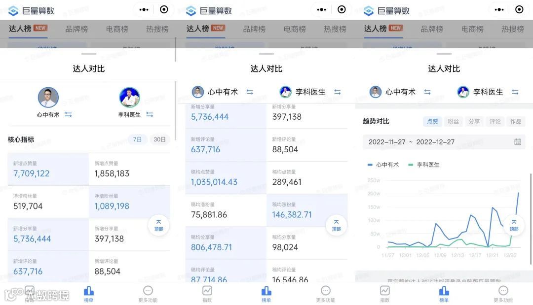 除了纵向排名,内容创作者和营销从业者还可以对不同达人进行横向对比。例如,在小程序中,选择李科医生和心中有术两位科普类达人,就可以对比两人的核心指标和趋势。