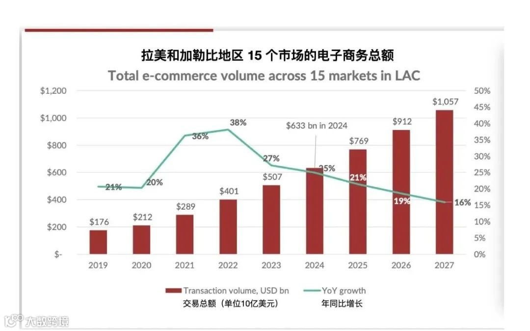 2023-2024年,拉美电商同比增长31%,远超亚洲、美国、欧洲的发展速度。2025年该地区电商总交易额预计达到7690亿美元,而到 2027年,预计电商交易总量将突破一万亿美元,是全球电商增长最快的地区之一!