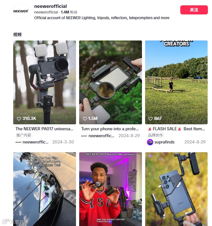 在TikTok上,Neewer官方账号@neewerofficial已积累近140万订阅者,内容主要围绕产品外观、使用场景和功能展示。通过高质量的视频直观呈现产品在实际拍摄中的应用,让用户在观看过程中既能感受到摄影的乐趣,也逐步建立起对品牌的信任与好感。