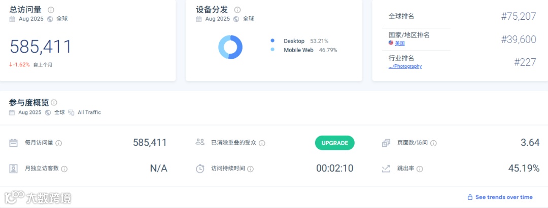 Neewer的独立站在全球排名7.5万,仅用58.5万月访问量即实现3.64页/次、2分10秒停留且跳出率仅45%,流量效率与黏性显著优于同级站点;美国本土排名3.96万,桌面端占比过半,说明在核心高价值市场已形成稳定“摄影”垂直受众,后续只需放大流量即可快速放大收益。