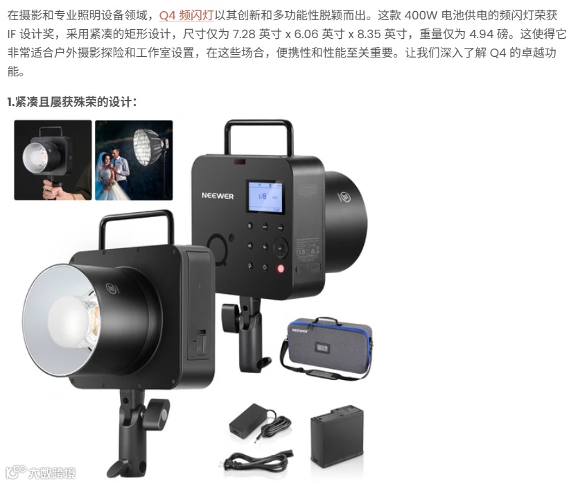 目前,Neewer技术专利数量达300余项,并受邀参加美国CES、NAB、WPPI等国际专业展会。2023年,Neewer新款Q4外拍闪光灯荣获了“iF设计奖”。