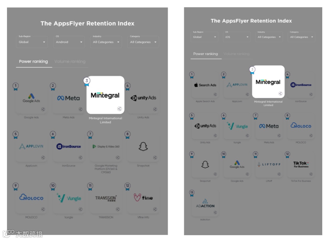 从此次的AppsFlyer榜单来看,Mintegral位列iOS、安卓双端留存实力榜应用总榜第三、游戏总榜第三,排名仅次于Google Ads 与Meta Ads。它也是国内唯一进入该榜单TOP5的广告平台。