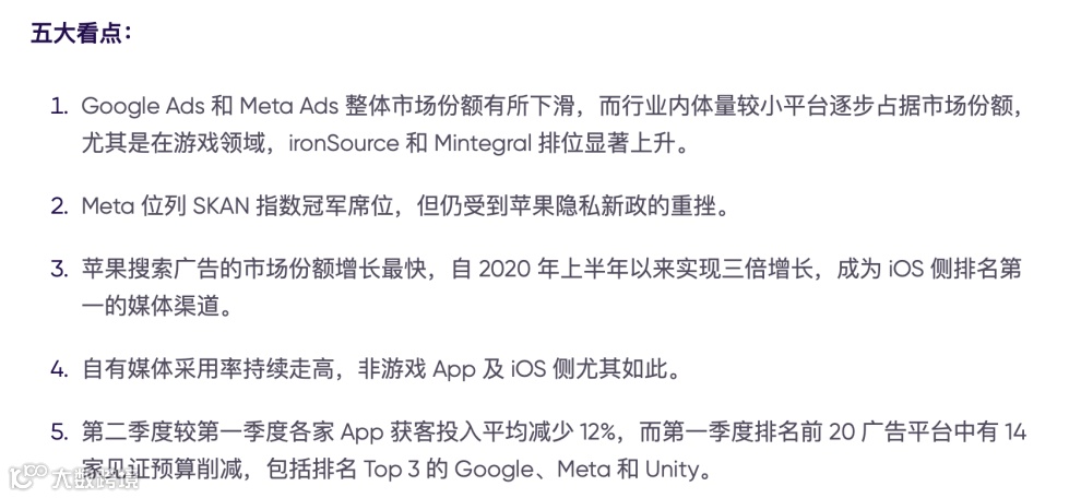 另外,不得不提的是苹果隐私新政。IDFA(广告标识符)默认关闭,广告平台精准定位能力、归因准确性都随之受到影响,精准化投放的难度被抬高。但广告主又在预算紧缩的背景下日益追求着营销策略科学性、精细化、精准性的升级,这就出现了痛点。