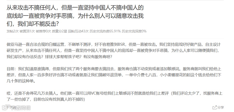 论坛上有卖家发帖称,做亚马逊一直合法合规的白帽运营,不刷单不测评,好不容易推到BSR,但是一直被攻击。知道幕后黑手是谁,但还是不舍得花几万去搞别人。