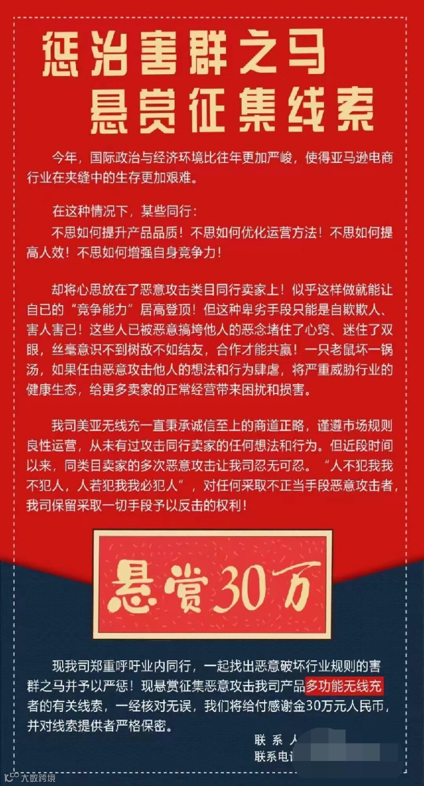 据悉,该公司亚马逊美国站的多功能无线充产品多次被人恶意攻击,严重影响了店铺的正常经营,于是向广大同行征集幕后黑手的相关线索,一经核对无误,将支付30万感谢金,并严格保密线索提供者的信息。