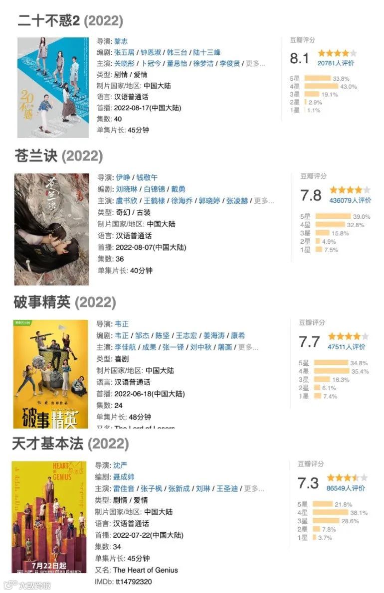 四部豆瓣评分7分以上剧集,为《二十不惑2》《苍兰诀》《破事精英》《天才基本法》。