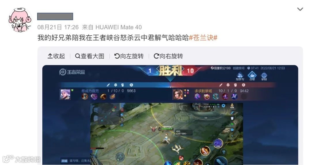 在站外,官方与网友们的造梗互动,也进一步形成了社交新现象。比如《苍兰诀》设置了角色号每日更新,有网友根据更新的对话自己脑补“小作文”,续写婚后生活;也有网友分享自己的“诀症”晚期状态,包括向尊上行礼的姿势、在王者荣耀怒杀“云中君”。