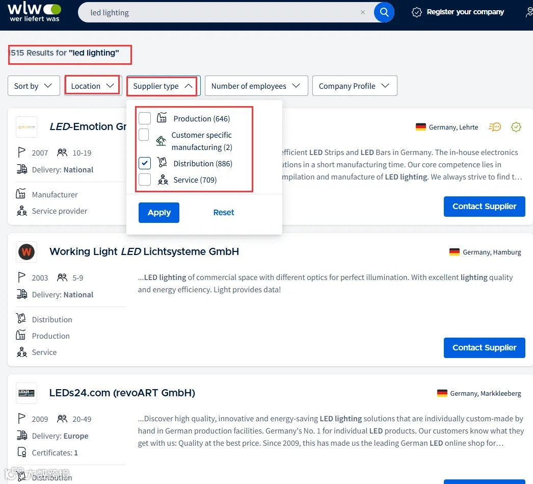 该网站类似传统黄页服务,支持通过产品词直接查找德国本地企业。其结构清晰,方便获取客户详细资料。