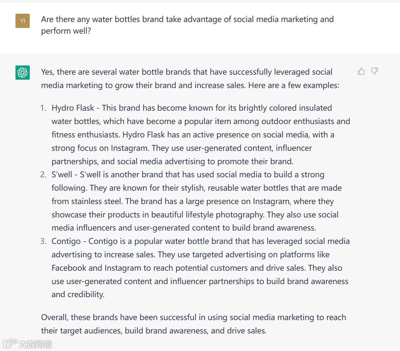我随口问 ChatGPT,“有哪些水瓶品牌利用社媒大获成功的么?”