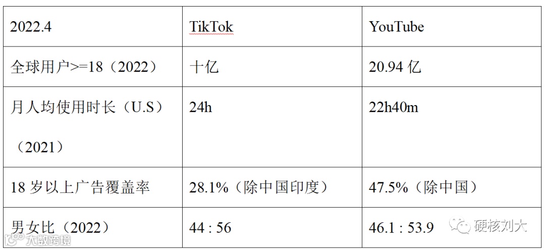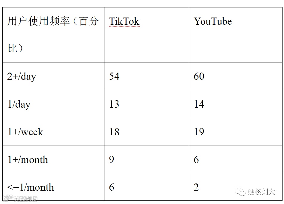TikTok和Youtube用户每天访问的比例分别为67%和74%,20%的TikTok用户和21%的YouTube用户日均访问10+,几乎没差;不考虑内容和用户需求的差异,可以得到的结论是TikTok和YouTube的用户分别对于平台不同内容的不同需求的程度从数量上看大致相等。(设想/枚举场景下两个产品的日活用户观看内容和需求,重合的/不重合的)