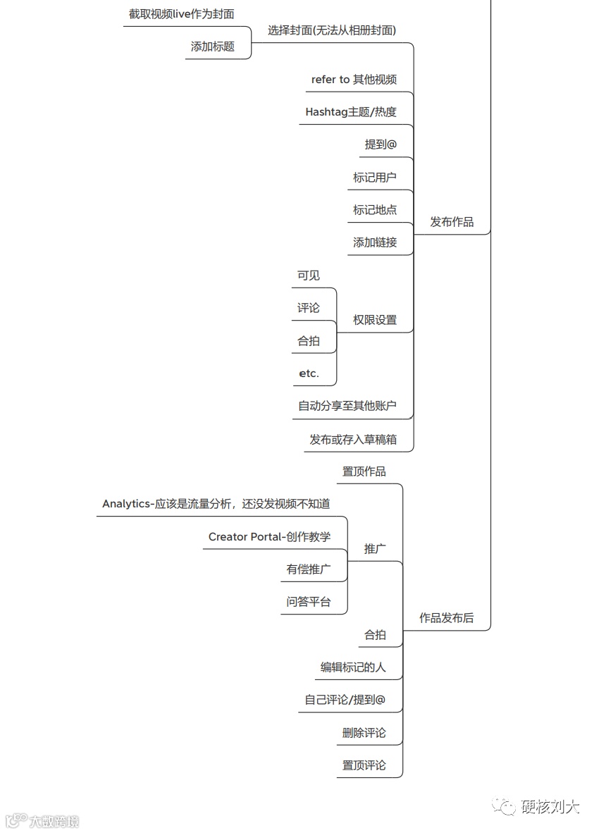 发布作品的页面中的功能主要有编辑视频主题(包括Hashtag,Refer,地点,链接 etc.),权限设置以及自动分享。