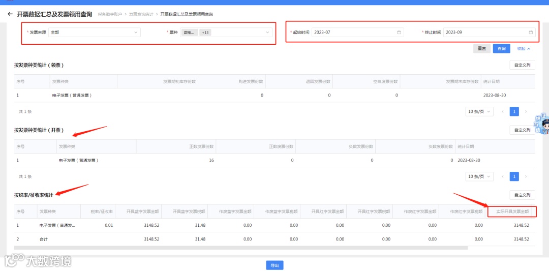 无论使用税控设备(如金税盘、税控盘或税务UKey)还是电子发票平台开具的发票,均可在此处查询汇总数据。