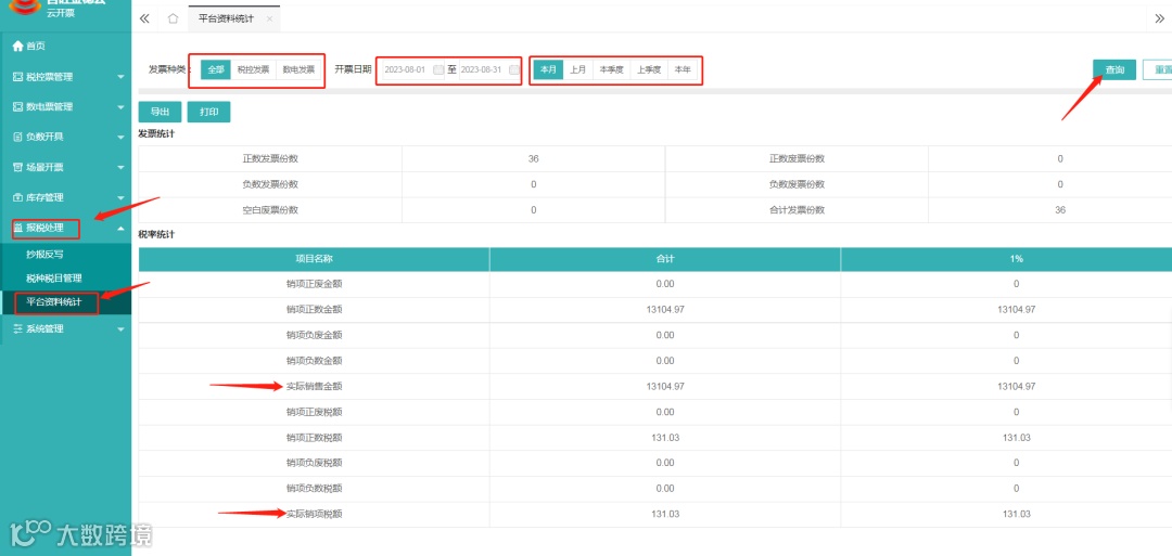 1. 登录云开票系统,进入【报税处理】—【平台资料统计】,如图: