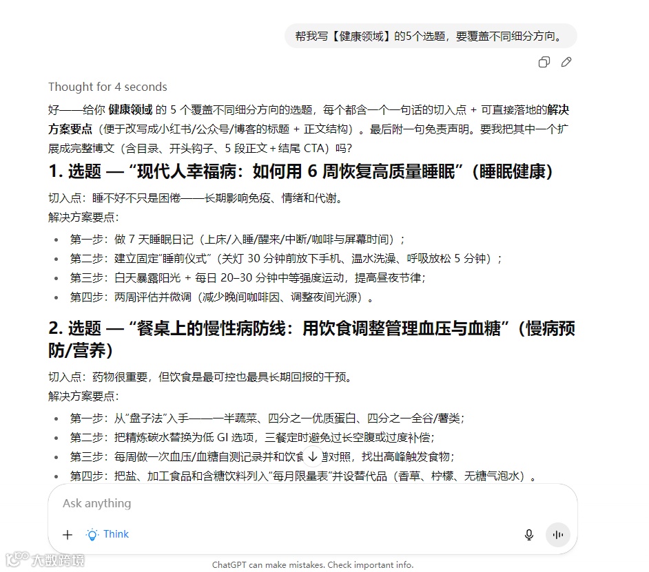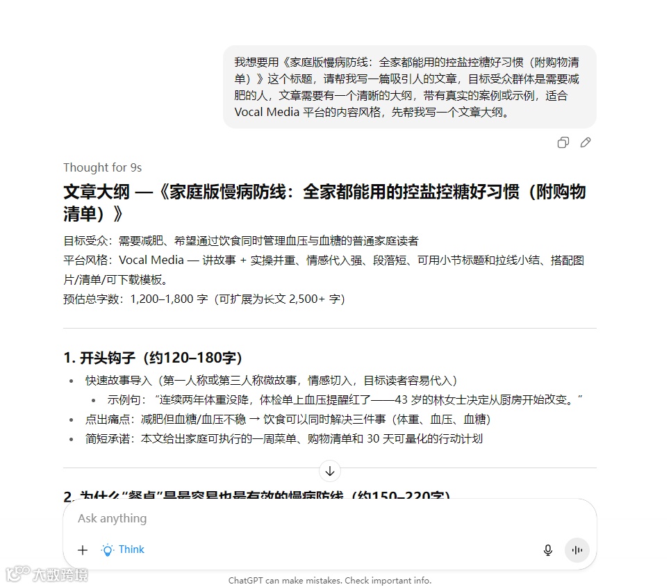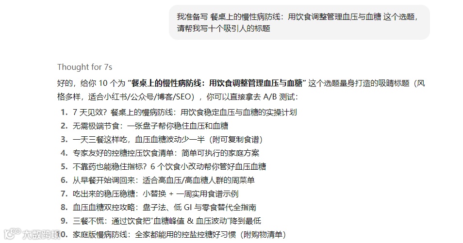 从 AI 给的标题里挑 “最有争议 / 最戳痛点” 的,比如“家庭版慢病防线:全家都能用的控盐控糖好习惯(附购物清单)”