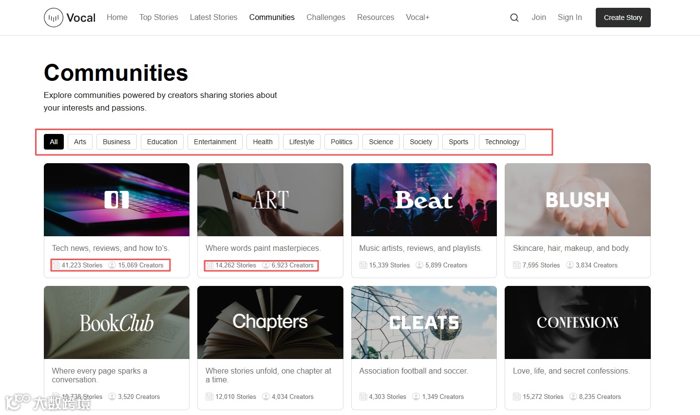 每个海外平台都有热门版块和主推方向,写文要顺应这些趋势,顺势而为才能多造爆款、多赚阅读收益。像 Vocal Media 平台可以进入“社区 / 频道” 分类去看哪些热门文章,上面每个版块有多少个作者,有多少篇内容都写的清清楚楚。还可以看平台的主页会放哪些主题文章吸引眼球,一般这种都是热门爆文。