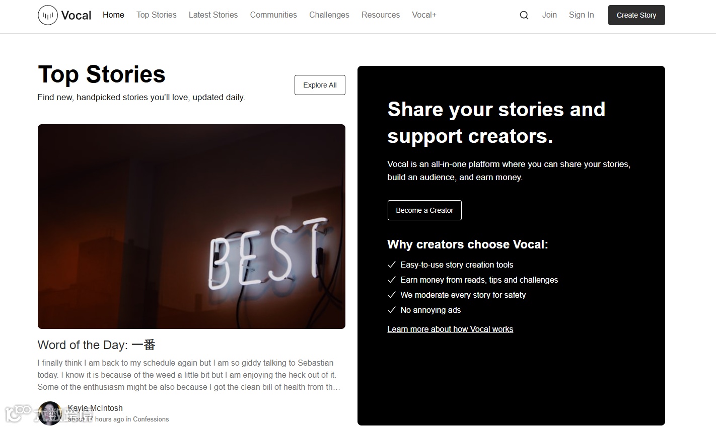 作为故事创作入门首选平台,Vocal Media 的核心吸引力在于 “零粉丝也能变现”—— 新账号只要内容过审,每 1000 次有效阅读就能赚$3−$5,远超同类平台的新手限制,2025年月活创作者已达80万。它的变现路径很灵活,除了基础流量分成,还有主题创作挑战奖金,粉丝打赏也无手续费,邀请新创作者还能拿推广奖励。