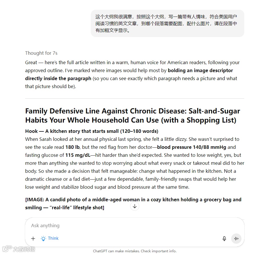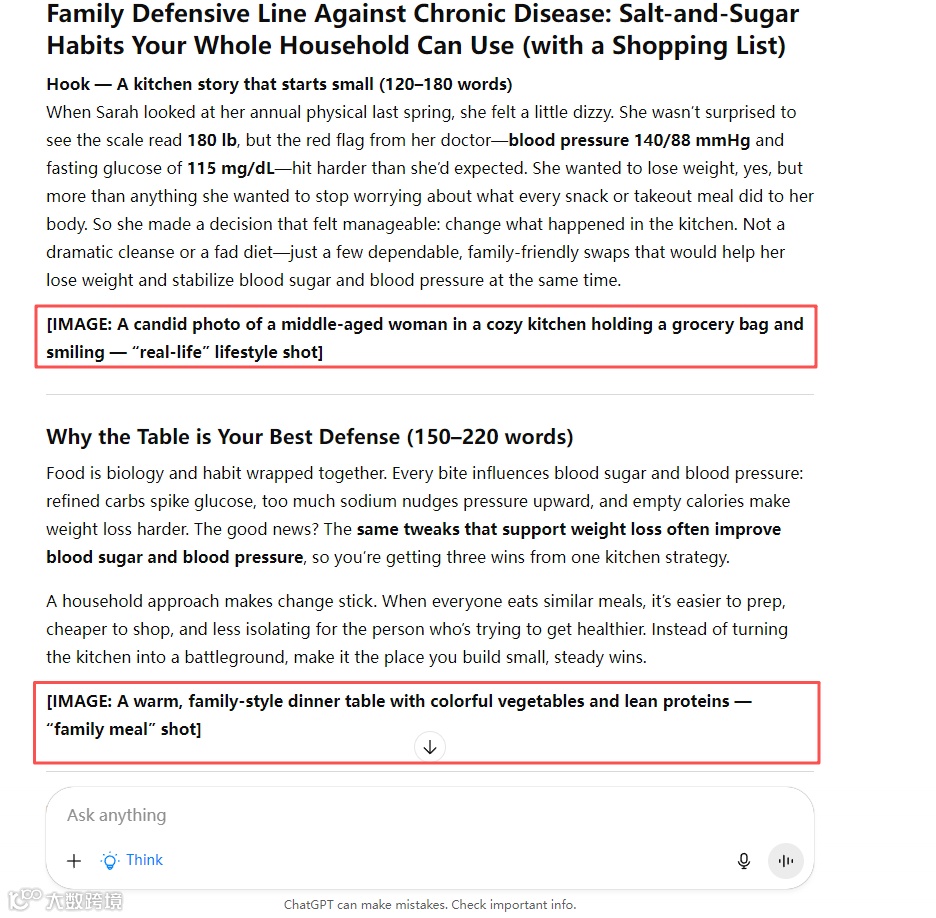 4.到写全文这一步,指令不需要复杂,简单即可,重点要符合XX地区用户的阅读习惯,还可以让AI给你“配图提示”。