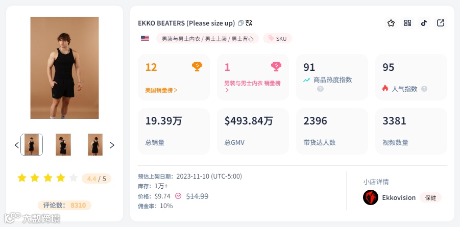 近日,一款名为EKKO BEATERS的紧身背心在TikTok上热销,自2023年11月10日上线以来已售出19.39万单。该商品通过短视频和直播广泛传播,在过去28天内有超过1,154位网红进行推广,其中视频推广占比约39%,直播推广占比达61%。