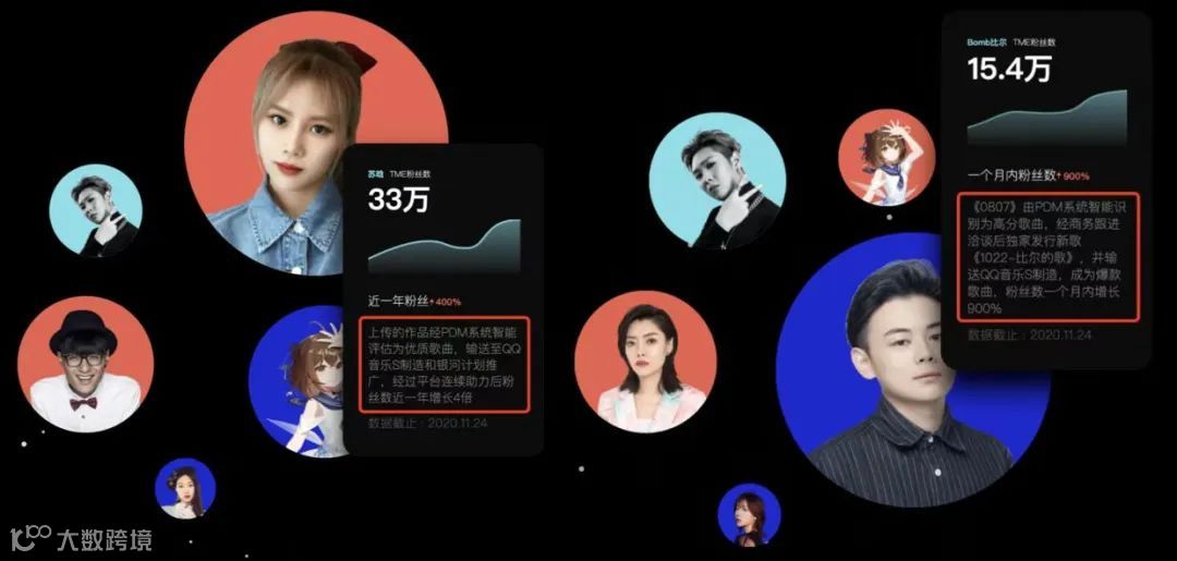 除了准确度,PDM技术也帮助了大量歌曲和音乐人走红。公开数据显示,PDM上线至今,光是腾讯音乐人的原创作品已“聆听”超过180万首,并从中选出5万首优秀作品和1.8万独立音乐人进行流量倾斜。像是《微微》《收敛》《厚颜无耻》《忘川彼岸》《我不是刘德华》等“国民级”爆款,以及创下独立音乐人流媒体歌曲首日播放纪录的《时光采样》,均受益于PDM技术的“pick”。而像是苏晗、Bomb比尔这样的年轻音乐人,更在PDM的推荐下,粉丝数成倍增长。