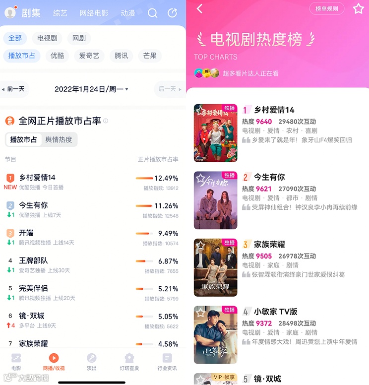 据云合数据显示,2021年上半年,优酷的独播剧有效播放占比高达77%,《觉醒年代》《山河令》《刑侦日记》进入新剧豆瓣评分TOP10中,且前两部均称得上是现象级爆款。8月《这!就是街舞》第四季开播后总播放量破亿,互动量超过1200万,在国内保持住热度和口碑的同时,汇集国际选手的玩法也赢得了更多海外关注。年末由周迅主演的《小敏家》开播,6天内就拿下4次猫眼热度日冠,直至收官其微博话题阅读量达131.47亿。春节《乡村爱情14》开播首日热度登顶,灯塔数据显示其首日实时正片播放市占率全网第一。