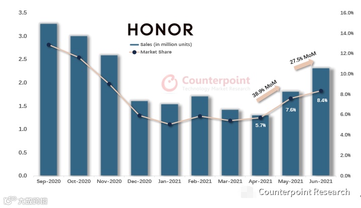 自2020年11月从华为剥离,荣耀经历了V字型触底反弹。去年Counterpiont发布过一份荣耀月度销量和市场份额变化图,2020年12月到2021年4月是荣耀的「至暗时刻」, 在此之后便一直走在上行的快速通道上。荣耀做对了什么?