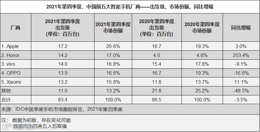 据IDC数据,2021年第四季度,中国市场智能手机出货量同比下降3.5%,全年中国智能手机市场出货量约3.29亿台,同比微涨1.1%。在用户换机欲望低迷、国内市场整体出货量增速放缓甚至滑坡的环境下,竞争白热化。