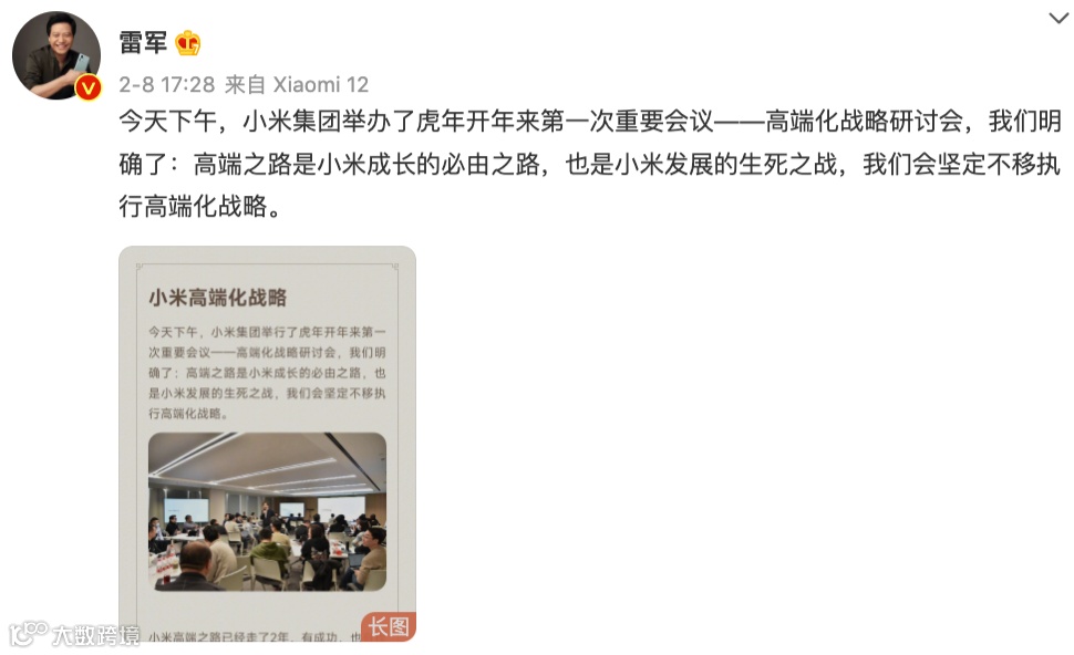 进入虎年,雷军又自己在微博上透露新春第一场重要会议即是高端化战略研讨会,强调「高端之路是小米成长的必由之路,也是小米发展的生死之战。」 他表示小米将在5年投入1000亿研发,为了产品和体验全面对标苹果。