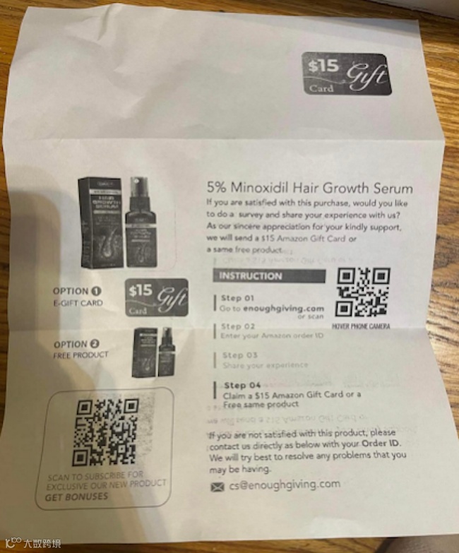 例如,外媒报道的内容显示,一位购买精华液的买家,在收货后不久,就收到了卖家寄来的产品宣传页,宣传页上附有二维码,并配上了“扫码抽奖”字样,而买家扫码进入网页之后,就看到了如何“留下五星好评”的指导教程和评论模板,买家完成好评后就可以获得佣金或礼品卡。