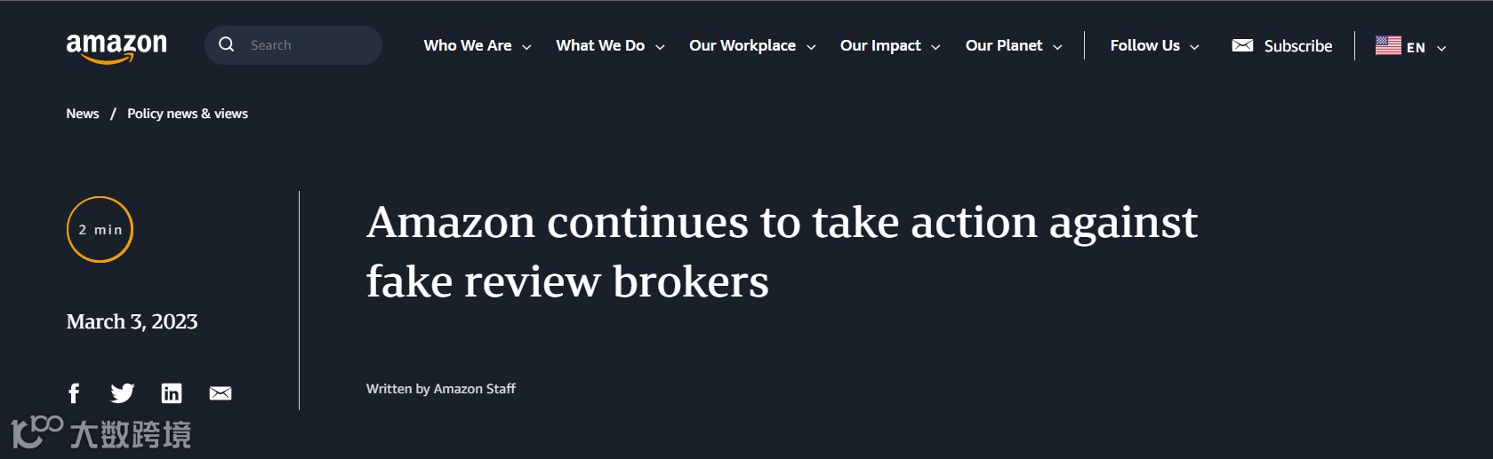 首先是在几天前,亚马逊发布了一篇新闻稿,宣布对Amazon Feedback、AMZ Trusted Review、Blue Marple、Woorke等六家提供虚假评论的“服务商”提起法律诉,同时明确表示,会追究不良行为者的责任。接下来,亚马逊很有可能会根据这些服务商的数据,找到牵涉其中的卖家,采取封号等措施。