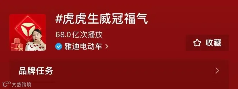 例如,雅迪引导参与者添加指定话题#虎虎生威冠福气,并在挑战赛中活用了相应的“贴纸任务”。这不仅使挑战赛更具趣味性,更实现了话题曝光量的极大提升。