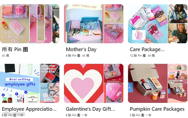 例如,其 Pinterest有母亲节礼物、情人节礼物、毕业礼物、伴娘礼物和员工答谢礼物等不同主题的收藏板。