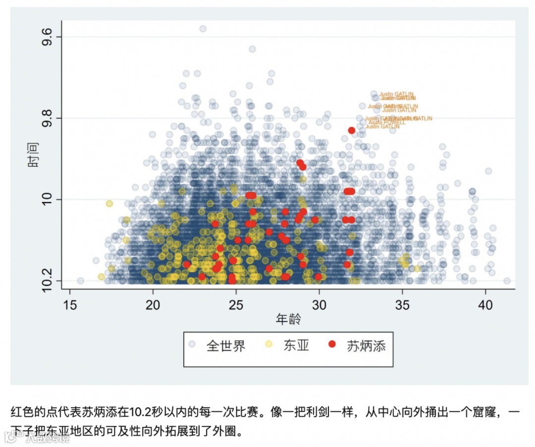 而在“苏炳添和博尔特差距还有多远”的问题下,知乎答主chenqin通过硬核分析和数据可视化,阐释苏炳添破记录背后的巨大意义: