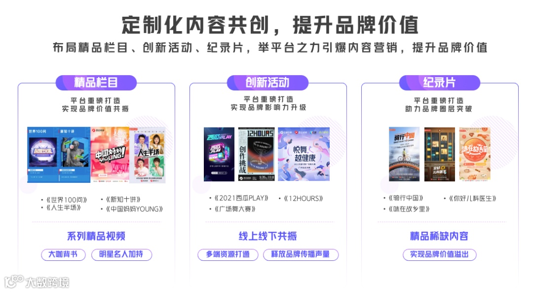 在内容方面,西瓜视频以“中视频+创新内容”为主要形式,深度布局精品栏目、创新活动、纪录片三大内容形态,围绕“大咖背书”、“线上线下联动”、“精品稀缺”等关键词,生产出更多元、更定制化的高质量的IP营销内容。
