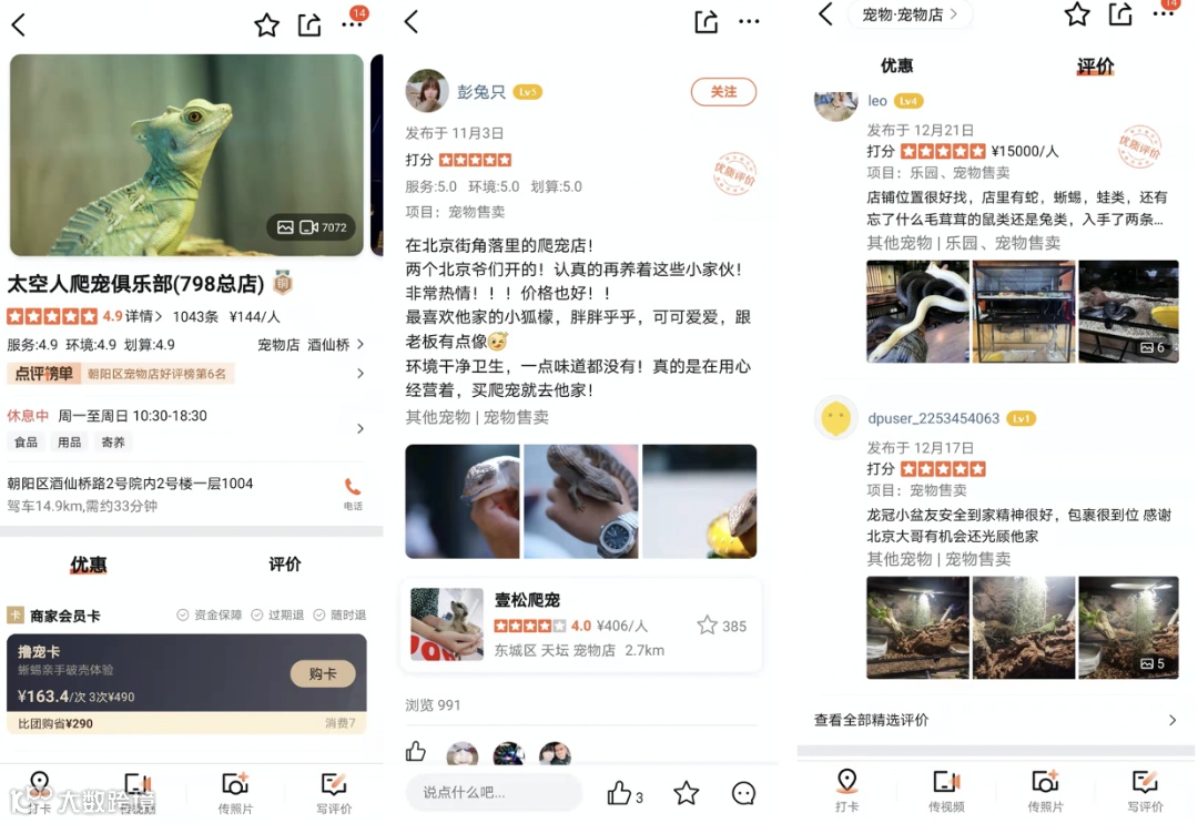 市场越来越热闹,交易需求开始从线上溢出至线下,线下异宠店与异宠宠物展开始在一二线城市出现。线下异宠店也以爬宠为主,不止提供异宠售卖,有的还会提供寄养、互动体验等服务。以北京地区的“太空人爬宠俱乐部”为例,其在大众点评上的成人单次互动票为129元、儿童为89元。