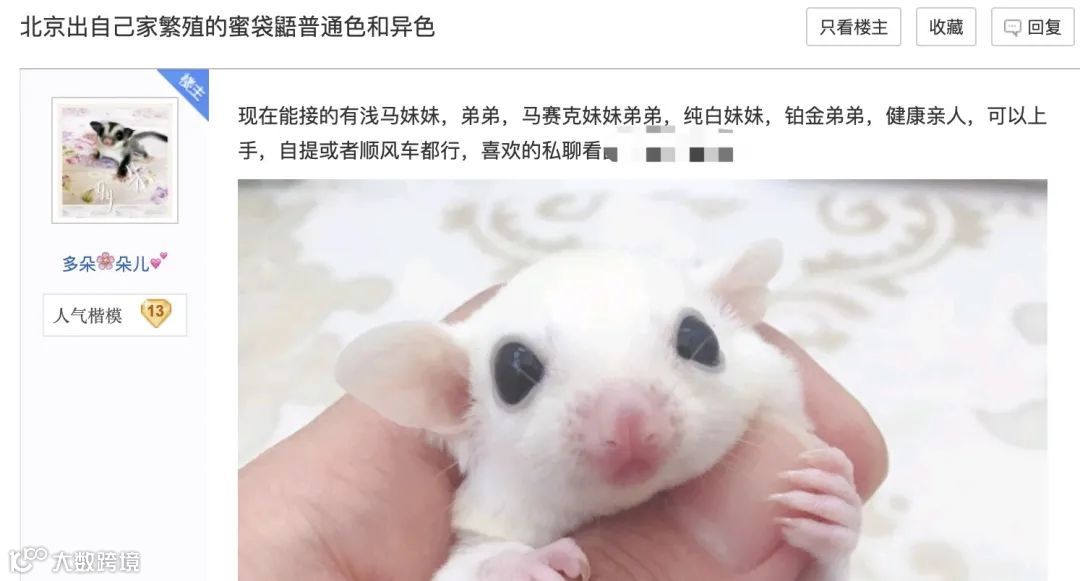 目前,异宠的购买渠道主要是线上。以蜜袋鼯为例,在淘宝上商家售卖的蜜袋鼯一只价格在300-400元,被称为“商家蜜”;“蜜袋鼯待领”贴吧中,则有着不少出售自家繁殖的蜜袋鼯的帖子,被称为“玩家蜜”。相比之下,异宠圈中更偏好从同城玩家手中收宠物,避免了活体快递的风险性,宠物健康也更有保障。