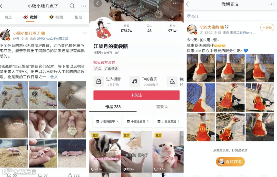 这类以“异宠”为主题的博主,在各大社交平台上越来越流行。微博上,养着塞巴斯托波尔鹅和柯尔鸭的博主@VSS大傻鹅 积累了近40万粉丝,从事爬宠养殖的博主@小狼小狼几点了 粉丝数超过90万;抖音上,@江柒月的蜜袋鼯 凭借几只可爱的“小蜜”,积累粉丝接近百万。