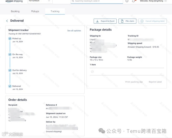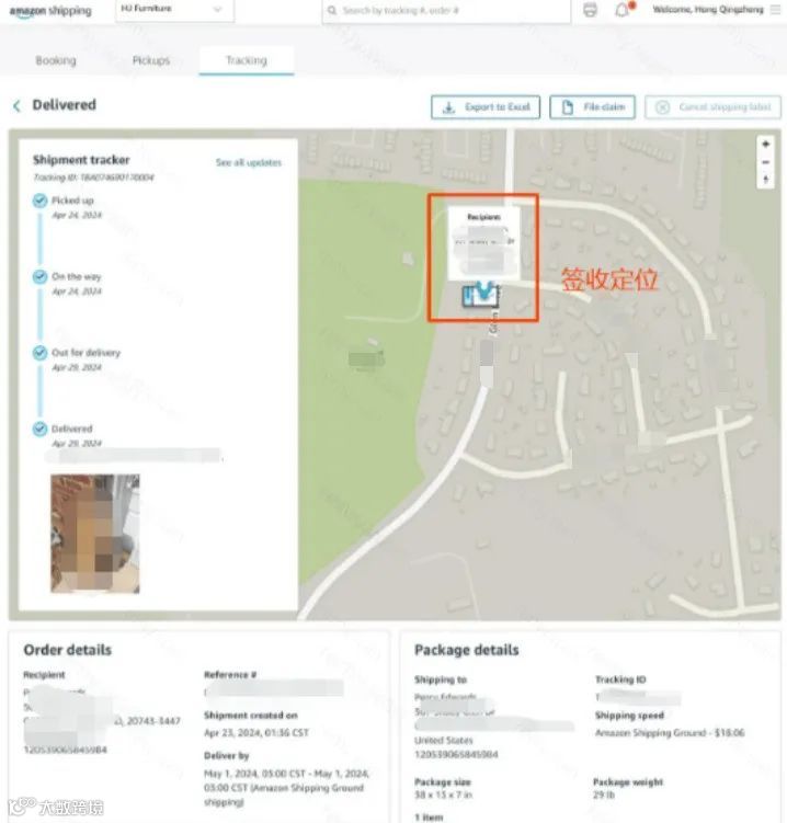 b. 亚马逊订单详情截图,包含编号、地址、运单号