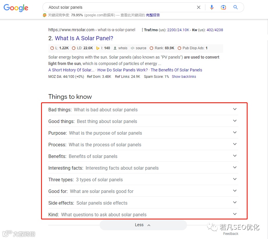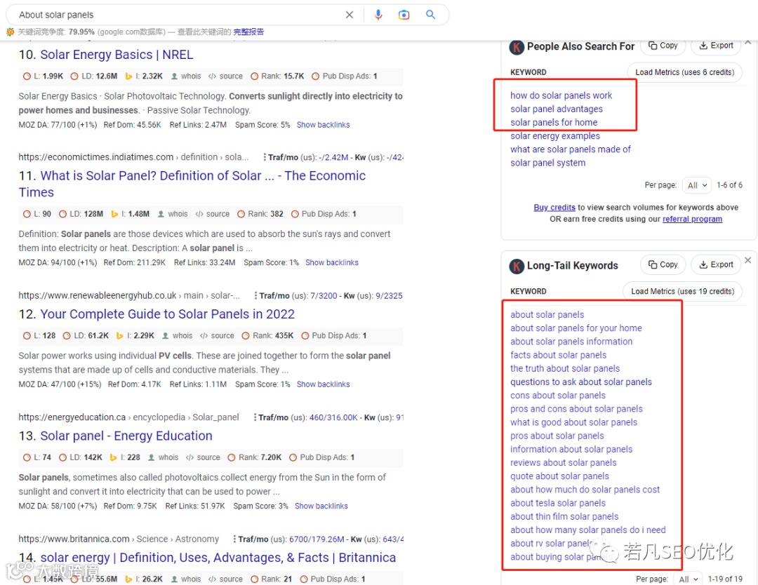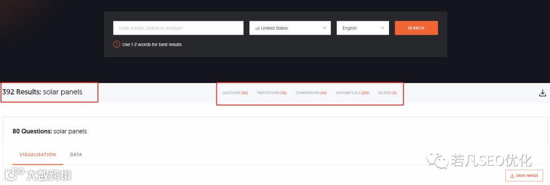 同样是使用solar panels放进去,他给我们拓展了392个相关话题,有问题词、介词、比较词、字母相关词。并且你可以导出表格慢慢挑选。