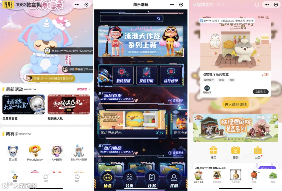 泡泡玛特在私域上取得的成功,使得“微信思路”成为潮玩入局者的“必备打法”:蛋趣潮玩、酷乐潮玩、TOP TOY、萌趣、盲盒星球、X11等潮玩品牌均上线了抽盒小程序。