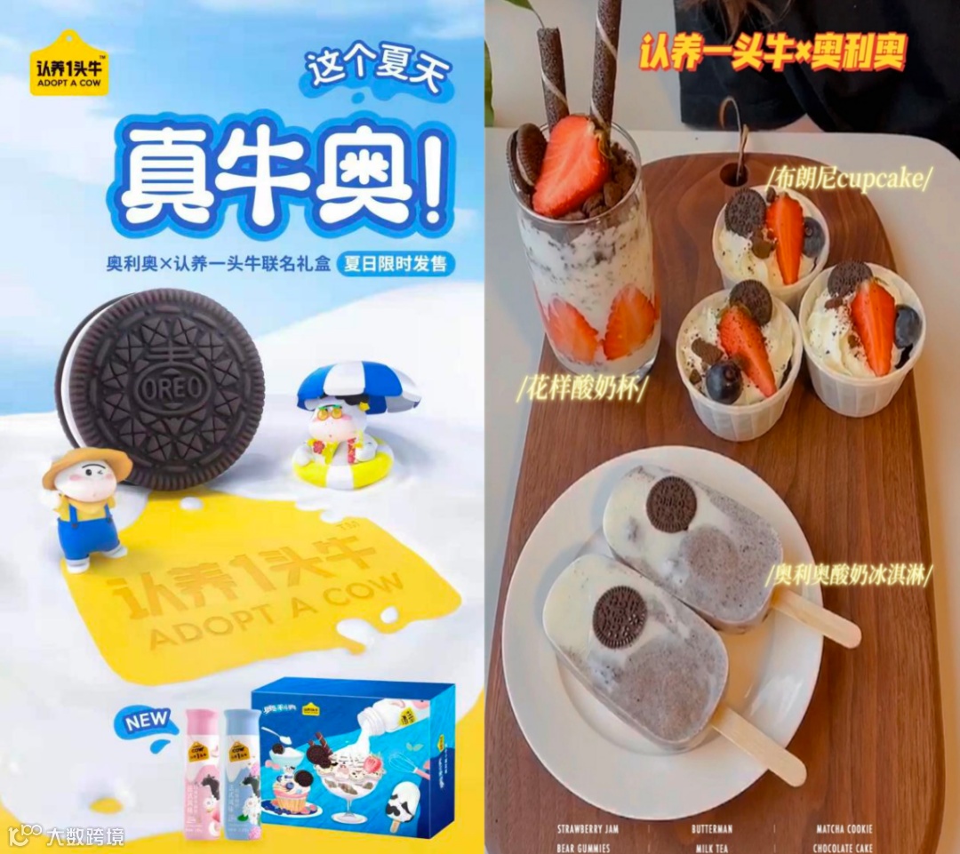 以认养一头牛与奥利奥的联名为例,双方的联名产品以认养一头牛两款酸奶和娟姗牛奶为甜品原料,搭配奥利奥小饼干,一起组成了“夏日甜心限定套盒”。在小红书等社媒平台,认养一头牛推出了酸奶杯、酸奶棒冰、布朗尼蛋糕等创新吃法,既让聚会、亲子、下午茶场景更具趣味,也为消费者提供更丰富的食用体验。