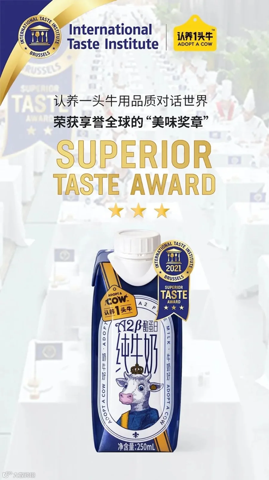 2021年5月,国际风味暨品质评鉴所公布了2021年国际美味奖章榜单,认养一头牛旗下纯牛奶和A2β-酪蛋白纯牛奶在口味、营养和设计方面获得国际食品界评委认可,分别摘得二星和三星美味奖章。这是品牌连续两年获得国际美味大奖, 而“三星奖章”也是这一大奖的最高荣誉。