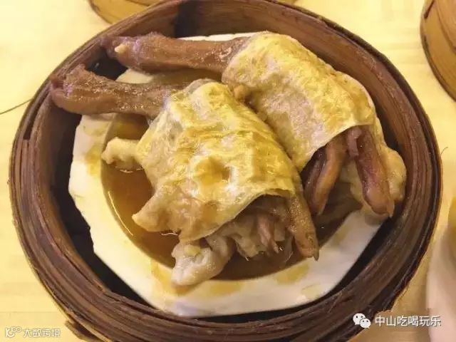 鸭脚扎:粤式早茶中少见的点心,用腐皮包裹鸭脚、猪肚和猪板筋,鲜香味美,每日限量供应,推荐必点。
